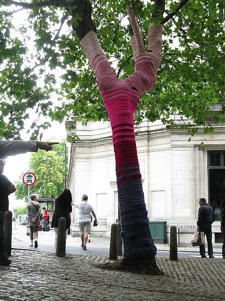 Yarn-bombing – also known as ‘yarn storming’, ’knit graffiti’, and ‘guerrilla knitting’ – merges street graffiti with knitting or crochet; knitted items, large and small, are added to the urban landscape in order to decorate it. Examples include scarves for trees, decorations added to lamp posts, and animals knitted onto benches. Emerging in America in 2005, this practice is both a form of political activism and a simple act of whimsical fun.
