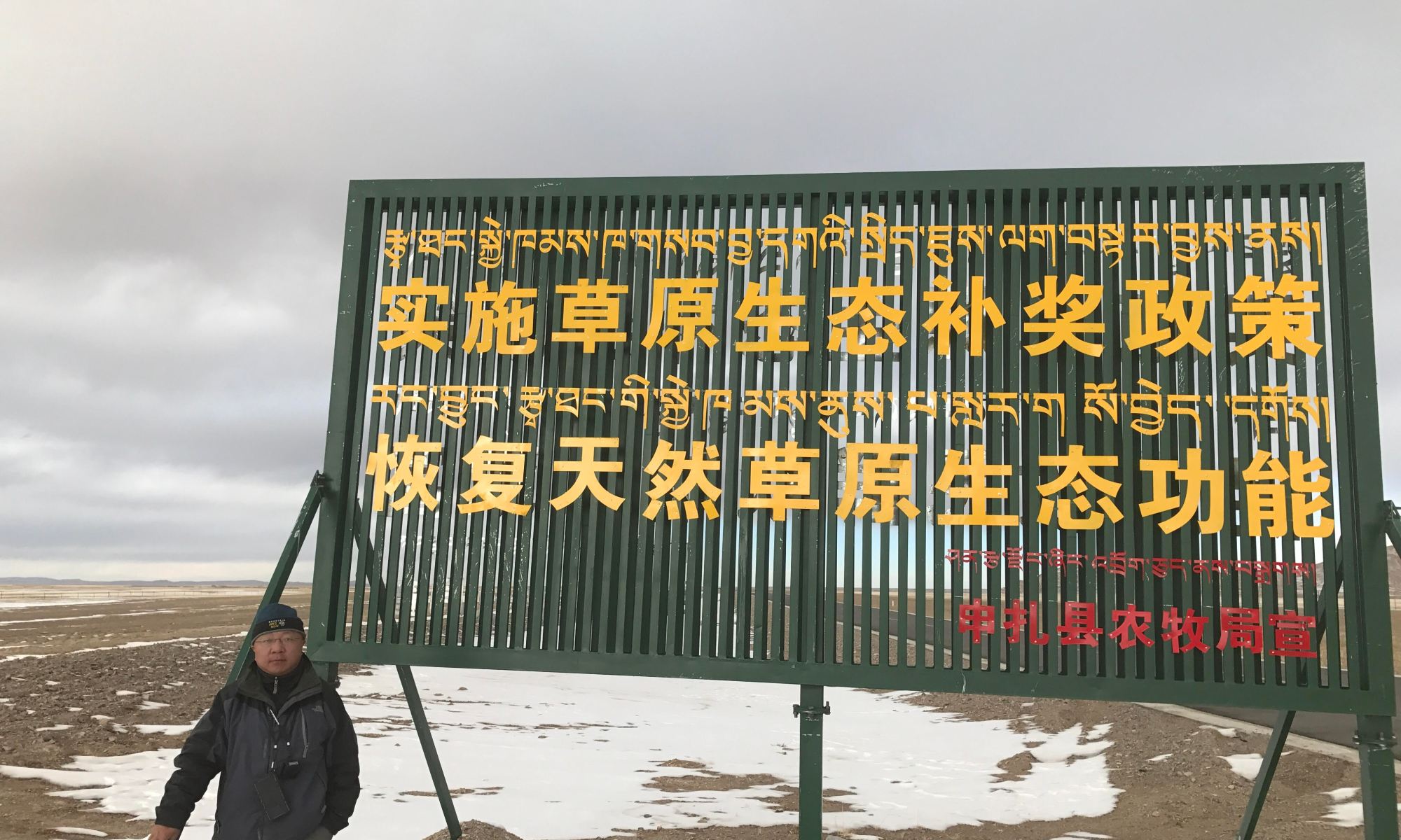 Feature image caption: A local government billboard that reads, “Implementing the policy of grassland ecological protection subsidy and reward, to restore natural grassland ecosystem functions”, Shentsa, Tibet, March 2017 (Photography by Yonten Nyima).