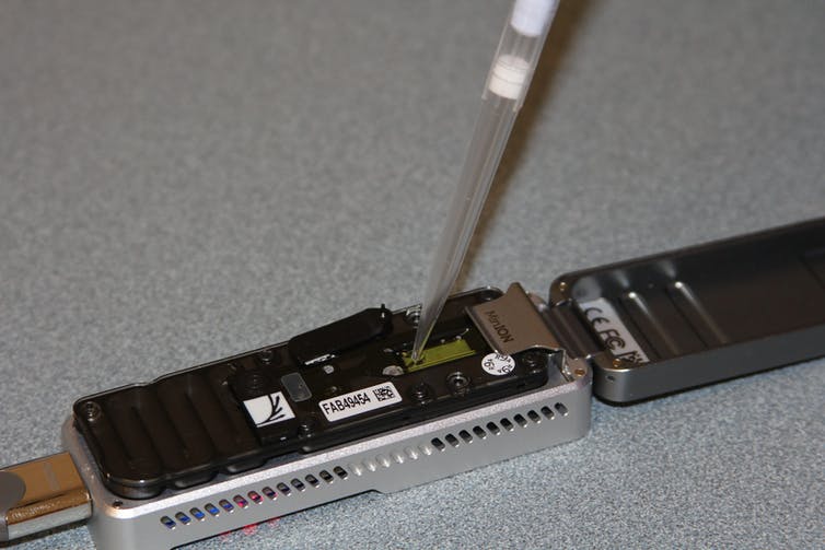 Researchers have increasingly turned to DNA sequencing to help identify and track these sorts of diseases. They use portable DNA sequencers, which are the size of a USB and can be easily carried for use in the field. One such sequencer, the MinION from Oxford Nanopore Technologies was used during the 2016 Zika virus epidemic in Brazil. It’s also being used to track the DRC’s Ebola outbreak.
