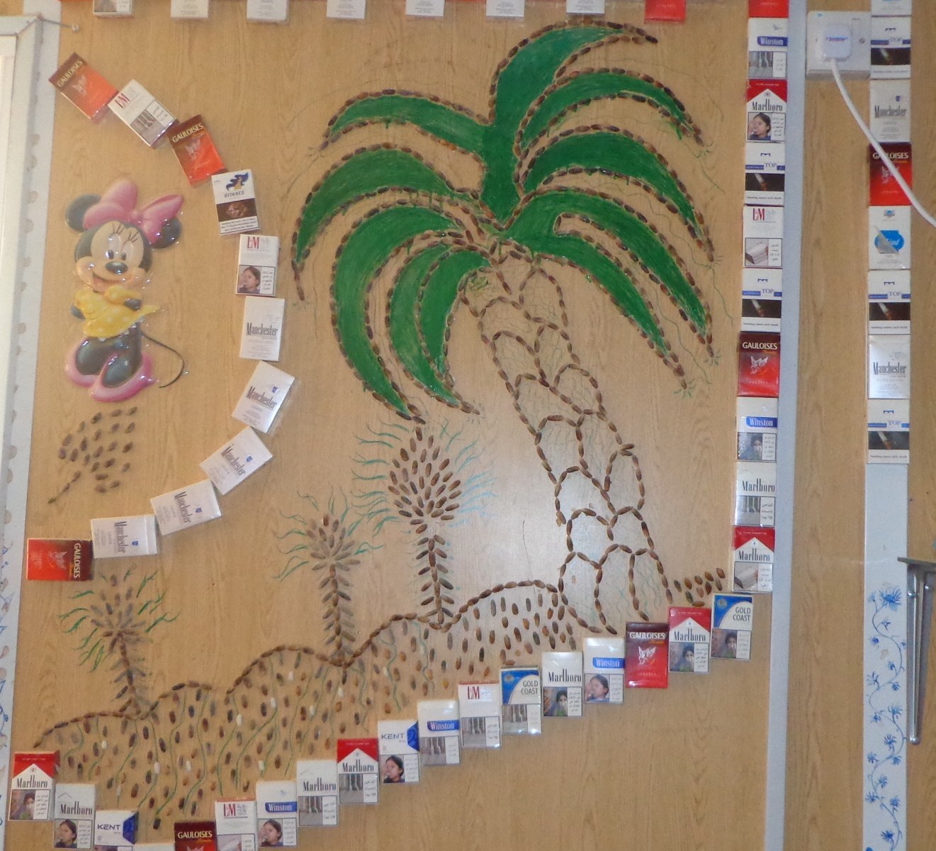 Fatima, at age 19, had her first child in the Za’atari refugee camp in Jordan. When her son was just a few months old her husband left Jordan and traveled to the UAE to work and send money back to support the family. But Fatima could not wait for his financial support. So she got a job as a teacher’s assistant in Za’atari and was soon promoted to 2nd grade teacher. As a result, she became the primary income earner for her extended family, who were living together in the camp. Fatima is successful and proud. She is also full of humor and warmth. When she has free time, she often creates artwork to help the dire aesthetics of life in the camp. With the most meager of materials – dried beans and cigarette boxes typically – she has decorated her family’s caravan, as well as some of her neighbors’ walls, and small schoolrooms with designs like palm trees or sayings from the Quran.