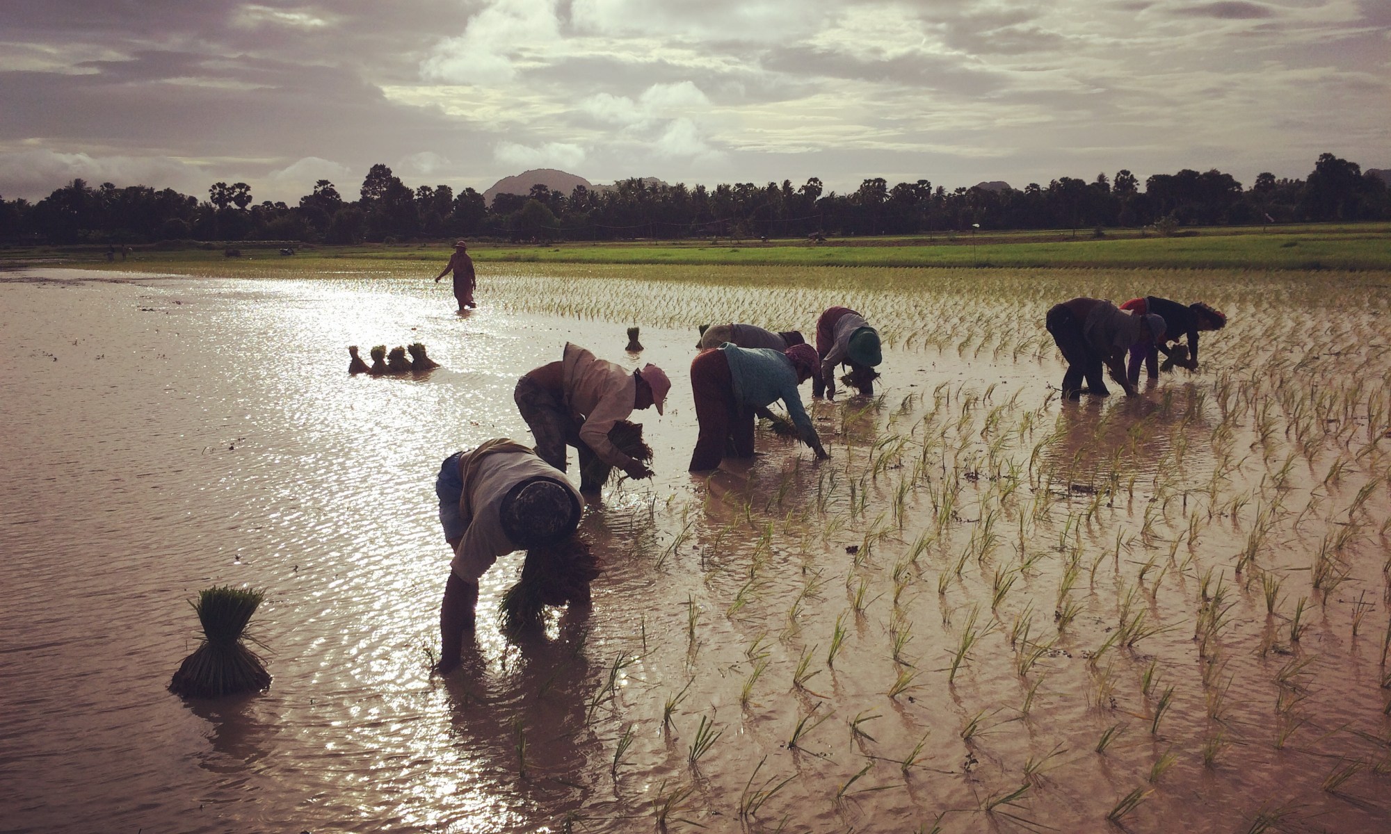 Featured image caption: Farmers transplanting rice together in southern Cambodia.