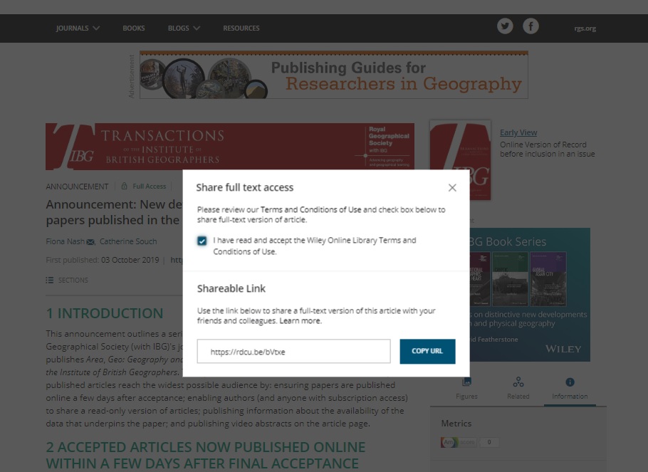 Nash F., & Souch C (2019) Announcement: New developments for enhancing the reach of papers published in the RGS‐IBG journals, Transactions of the Institute of British Geographers, 44 https://doi.org/10.1111/tran.12341