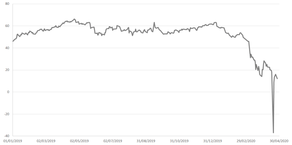 Daily spot prices of WTI crude oil per barrel between 1 January 2019 and 20 April 2020 as traded in the New York Mercantile Exchange. Source:https://fred.stlouisfed.org/series/DCOILWTICO. This file is licensed under the Creative Commons Attribution-Share Alike 4.0 International license.