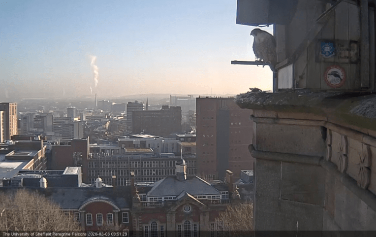 The quarantine affects our ability to directly encounter nonhuman life in our fieldwork and daily rhythms: cycles to work, strolls in the park, weekend hillwalking. An inevitable result of twenty-first century confinement, the digital realm is playing an increasingly prominent role in our lives and our encounters with nature. From our homes—in three European countries—we have found collective enjoyment watching peregrine falcons observe the sunrise over South Yorkshire via the University of Sheffield’s live webcam. Since 2012 the webcam has broadcast live from a peregrine roost above the spire of St. George’s church in the center of the city. The birds are “an established feature of Sheffield’s skyscape,” yet our first experience of them occurred during lockdown. A technologically mediated atmosphere, a collective affect, a common communicability with urban wildlife.