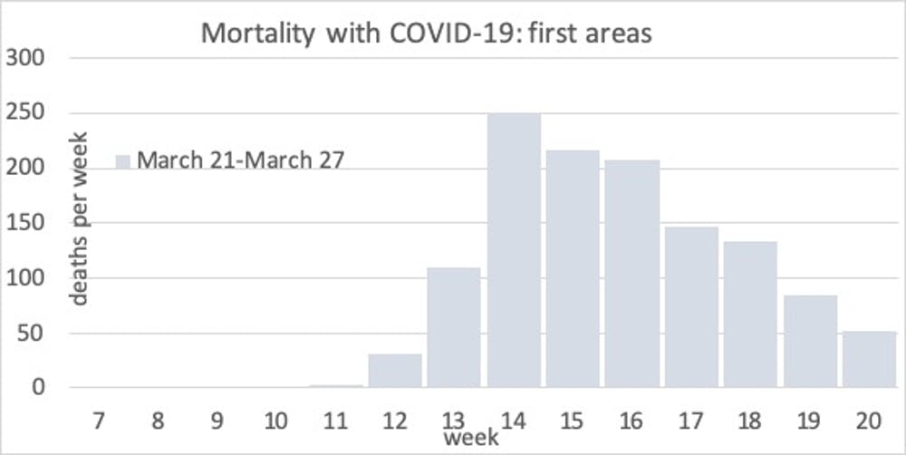 Doing this gives us seven groups, starting with the week of March 21 to March 27 and ending with the week of May 2 to May 8. The first such grouping is of those districts which recorded their highest number of coronavirus-related deaths in the first of these weeks.