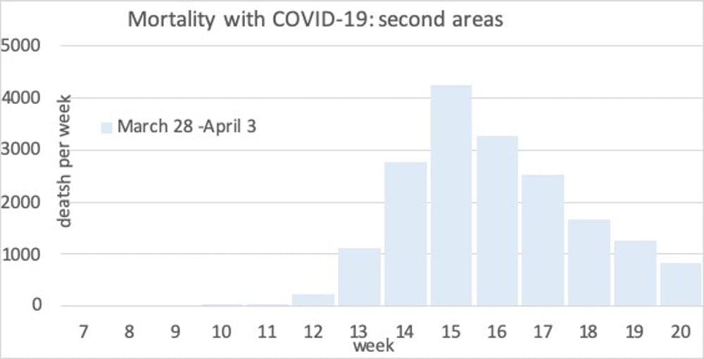 The full lockdown in England and Wales began on March 24, during the week in which deaths peaked in the first set of areas shown above. People were already social distancing to some extent before that date, so we should not expect to see any sudden drop in mortality two or three weeks after that date in the graphs above, and we do not.