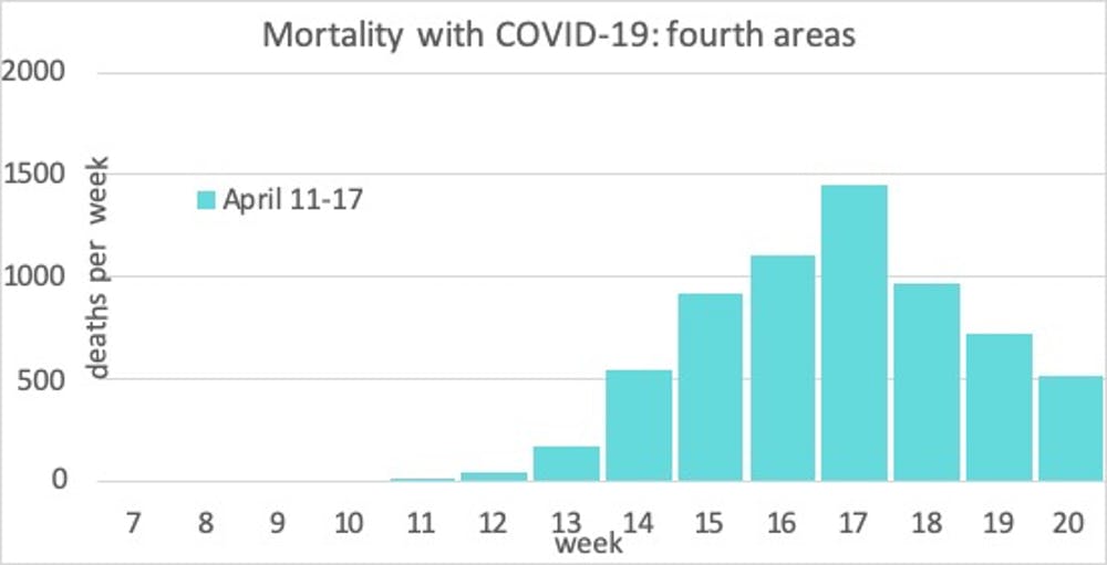 Grouping local authority districts by the week in which mortality with COVID-19 peaked helps break down the national pattern into a series of smaller, local curves. Only the first four graphs are shown as 92% of all deaths occurred in these district groupings. Each appears to be very similar to the next except that the vertical scales on each graph vary because more areas saw deaths peak in early April.