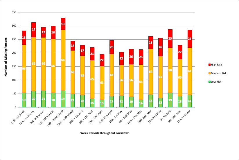The red high-risk categories in these data include children being ‘repeatedly missing’ and accordingly categorised as at higher risk and those who are deemed to be on suicidal journeys. The unit also reports a greater number of unidentified bodies being found than usual during the pandemic (19 bodies from 23rd March to 31st May, with only 3 identified so far), which may relate to unreported missing people.