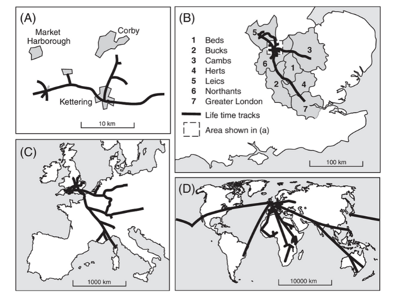 Despite all being pretty infectious, the maps in figure 1 show orders of magnitude changes in the speeds with which each pathogen spread across continents. Smallpox took centuries to spread from its endemic zones in Asia to reach Europe and Africa. The pandemic of bubonic plague, named ‘the Black Death’ in the 14th century took around 15 years to spread from its apparent origin in China to the far reaches of Western Europe. The influenza pandemic of 1918 then took just a few months to spread globally. Contrast these to recent pandemics, including SARS, H1N1 (‘Swine Flu’) and now SARS-CoV-2, where spread to the other side of the globe has occurred within days and weeks.