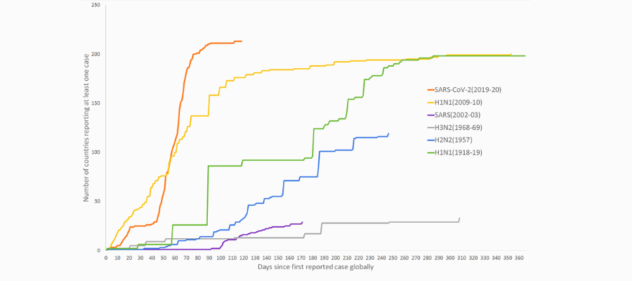 To quantify trends in the speed of spread of outbreaks, we gathered data on the timings of reported first cases in each country for a set of pandemics over the past century as part of ongoing work. Plotting the number of countries reporting cases cumulatively since the first reported case globally gives an indication of how rapidly and far each pathogen spread (Figure 2). The graph shows that it has taken only around 70 days for SARS-CoV-2 to reach nearly every country in the World – a speed that outpaces all the other pandemics studied, and only the recent H1N1 swine flu pandemic comes close.
