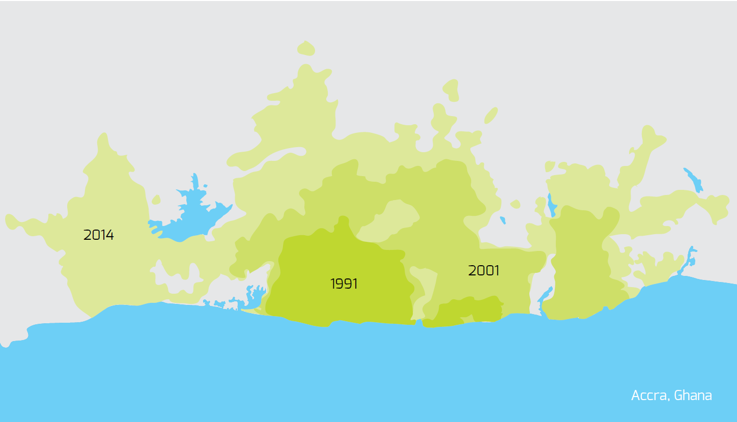 Over the last few decades, like many urban areas around the world, the built-up area of Greater Accra has grown at a huge speed and scale, more than doubling every ten years. This level of growth means that massive amounts of infrastructure need to be built to service the newly settled areas, including water pipelines, roads, electricity wires, gutters and sewers, all of which have to be extended at breakneck speed to service the rapidly expanding peripheries.