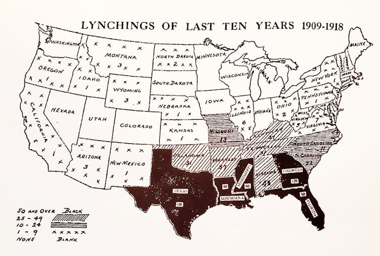 For example, the Equal Justice Initiative, the Alabama-based legal defense group run by Bryan Stevenson, has produced a modern map of historical lynching. It’s an interactive update of the anti-lynching cartography made 100 years ago – although a full reconstruction of lynching terror remains impossible because of incomplete data and the veil of silence that persists around these murders.