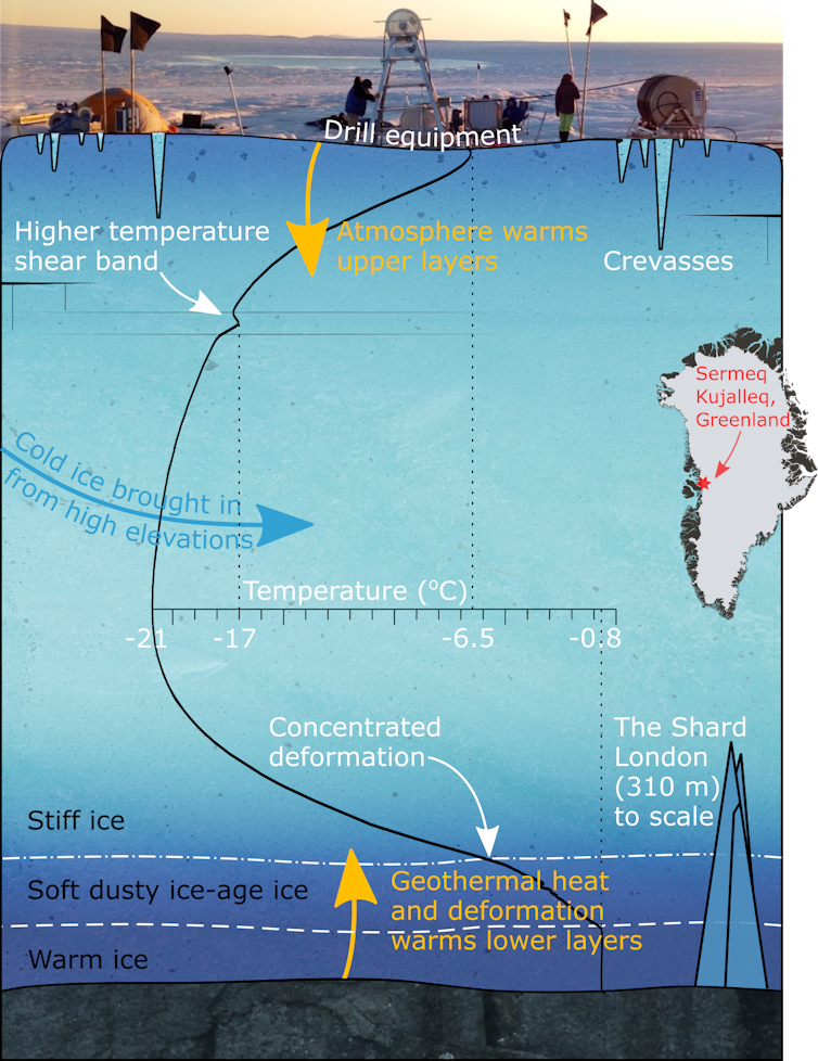 Second, we observed three distinct ice layers within the glacier. Two of these were predictable. The upper 890 metres of the glacier was made of cold and stiff ice. Beneath that was older, weaker ice dating back to the last ice age. This ice is weaker because it contains particles of ice age dust, which disrupts the bonds between individual ice crystals.
