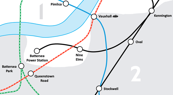 The drawing of the Northern Line Extension, however, appears to have pushed the famous design beyond its limits. Firstly, Kennington Station, which has always been located inside Zone 2, had to be moved to become a dual (Zone 1/2) station that straddles both zones. This allowed the map to continue to show ticketing zones as concentric rings (as it always has done). With both Vauxhall and Kennington now dual-zone stations, the issue would appear to be solved. In keeping with the design principles of the map, however, the line from Battersea Power Station to Kennington (both classed as Zone 1 for that trip) should not pass through Zone 2. Likewise, the line from Queenstown Road to Vauxhall (both classed as Zone 2 for that journey) should not pass through Zone 1.