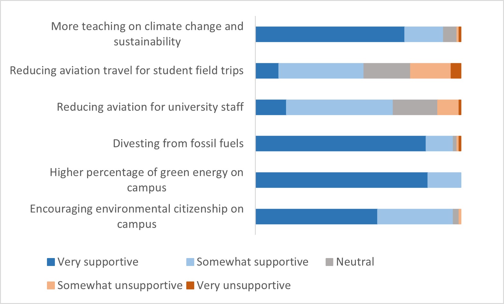 Our research involved talking to students about their perceptions of environmental sustainability at the university. We found that 96% of students agreed that sustainability on campus was important to them, but 62% said the university was not doing enough. Overall, we found a lot of support among students for a range of different strategies to reduce the carbon intensity of Geography as a discipline (see figure below). Importantly, the student voice should facilitate change and their perspectives included in decision-making.