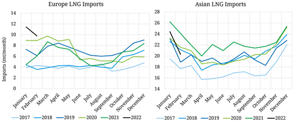 Two months into the war, and with alternative pipeline imports from Norway and Algeria at full capacity, this dynamic is fundamentally changing. The EU has become a direct competitor for LNG with other markets in Asia and Latin America, as it is willing to snatch LNG cargoes on the spot market at all costs. In the period 2019-2021, on average 27% of US LNG exports went to the EU. By January 2022, even before the war, this had already shot up to 37%, mainly driven by the premium in European prices.