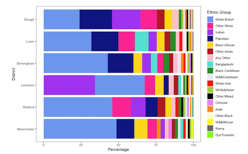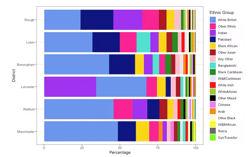 Population breakdowns by ethnic group for the most ethnically diverse districts outside London in 2021: