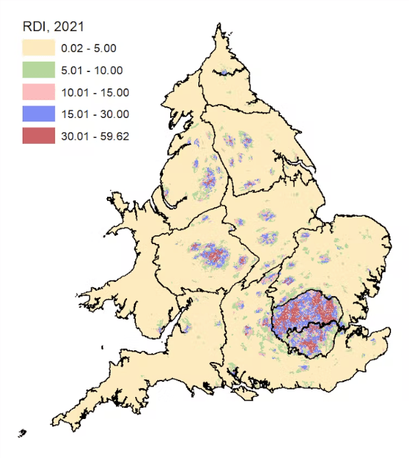 In population studies, to compare levels of ethnic diversity between places and over time, we can use the reciprocal diversity index (RDI), with scores ranging from zero (one ethnic group only in an area) to 100 (equal share of all ethnic groups). Our findings show that ethnic diversity in England and Wales has steadily increased: from 2.02 in 2001, to 3.56 in 2011, to 5.14 in 2021.
